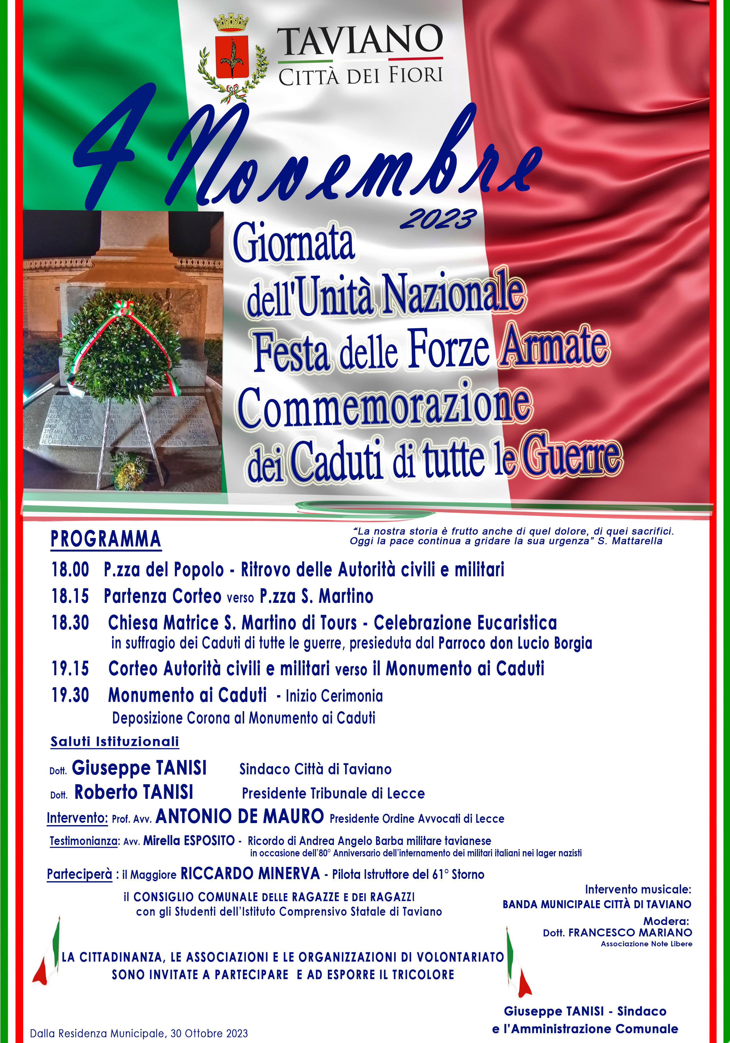 4 Novembre 2023 - Festa dell'Unità Nazionale e delle Forze Armate, Commemorazione dei Caduti di tutte le Guerre