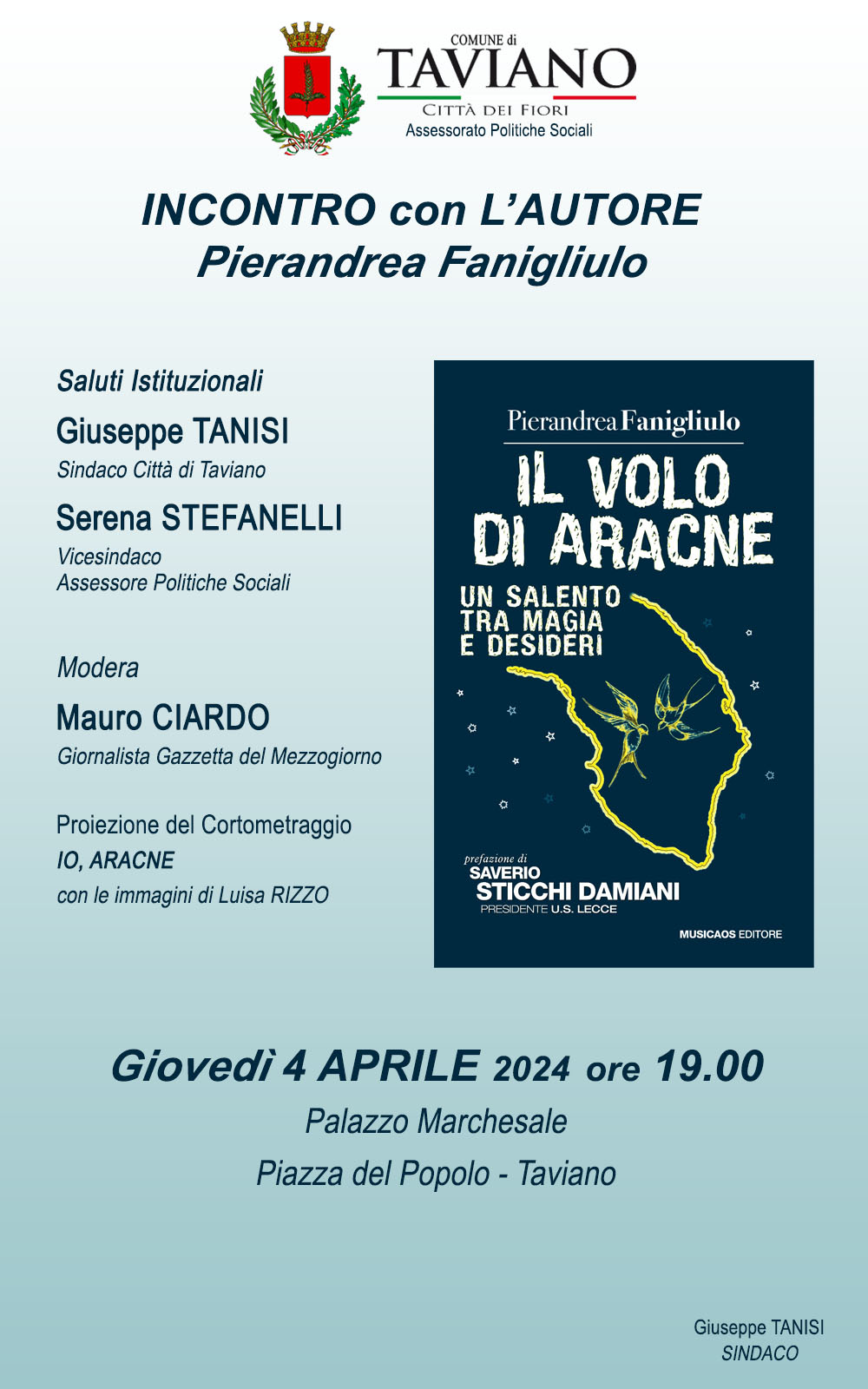 Il Comune di Taviano nell'ambito del progetto Città che Legge "A Libro Aperto", organizza l'incontro con l'autore Pierandrea Fanigliulo in programma per Giovedì 4 Aprile 2024 alle ore 19.00 presso il Palazzo Marchesale.