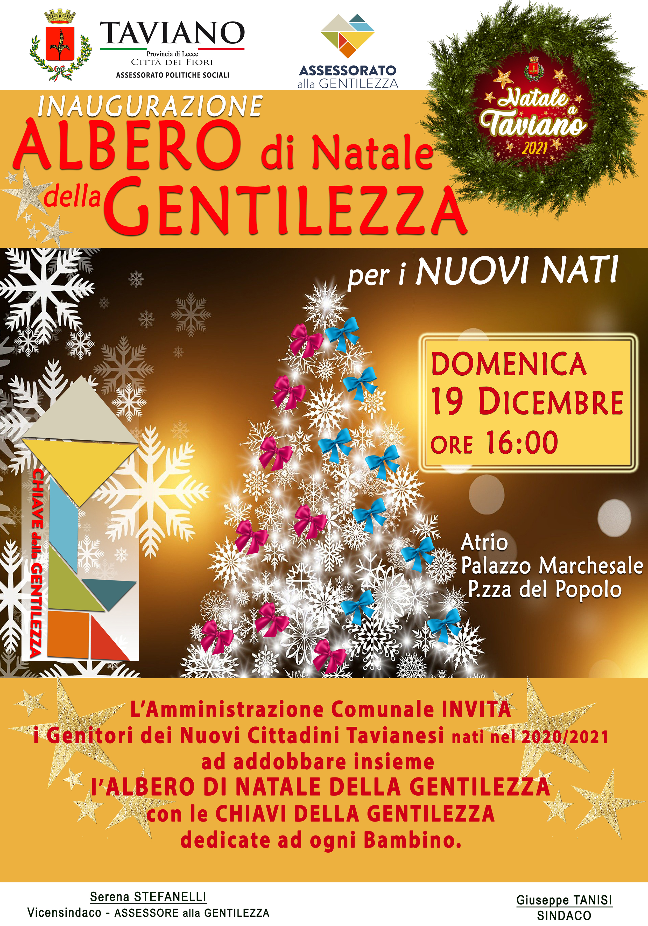 L’Amministrazione Comunale su iniziativa del Sindaco Giuseppe Tanisi, e della Vicesindaco e Assessore alla Gentilezza Serena Stefanelli, in occasione delle festività natalizie inaugurano l’ALBERO DI NATALE DELLA GENTILEZZA per i NUOVI NATI nel 2020/2021, che sarà addobbato con le CHIAVI DELLA GENTILEZZA dedicate ad ogni piccola e piccolo cittadino tavianese, come simbolo di Vita e di Rinascita soprattutto in un periodo così complesso e difficile come quello nel quale stiamo vivendo.