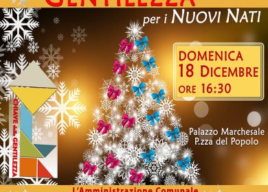 L’Amministrazione Comunale su iniziativa del Sindaco Giuseppe Tanisi, e della Vicesindaco e Assessore alla Gentilezza Serena Stefanelli, in occasione delle festività natalizie Vi Aspettano Domenica 18 Dicembre alle ore 16:30 in Piazza del Popolo per l’Accensione dell’ALBERO DI NATALE DELLA GENTILEZZA dedicato ai NUOVI NATI nel 2022.