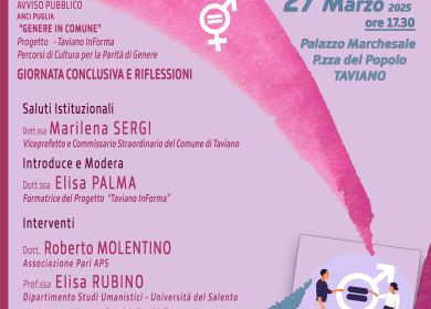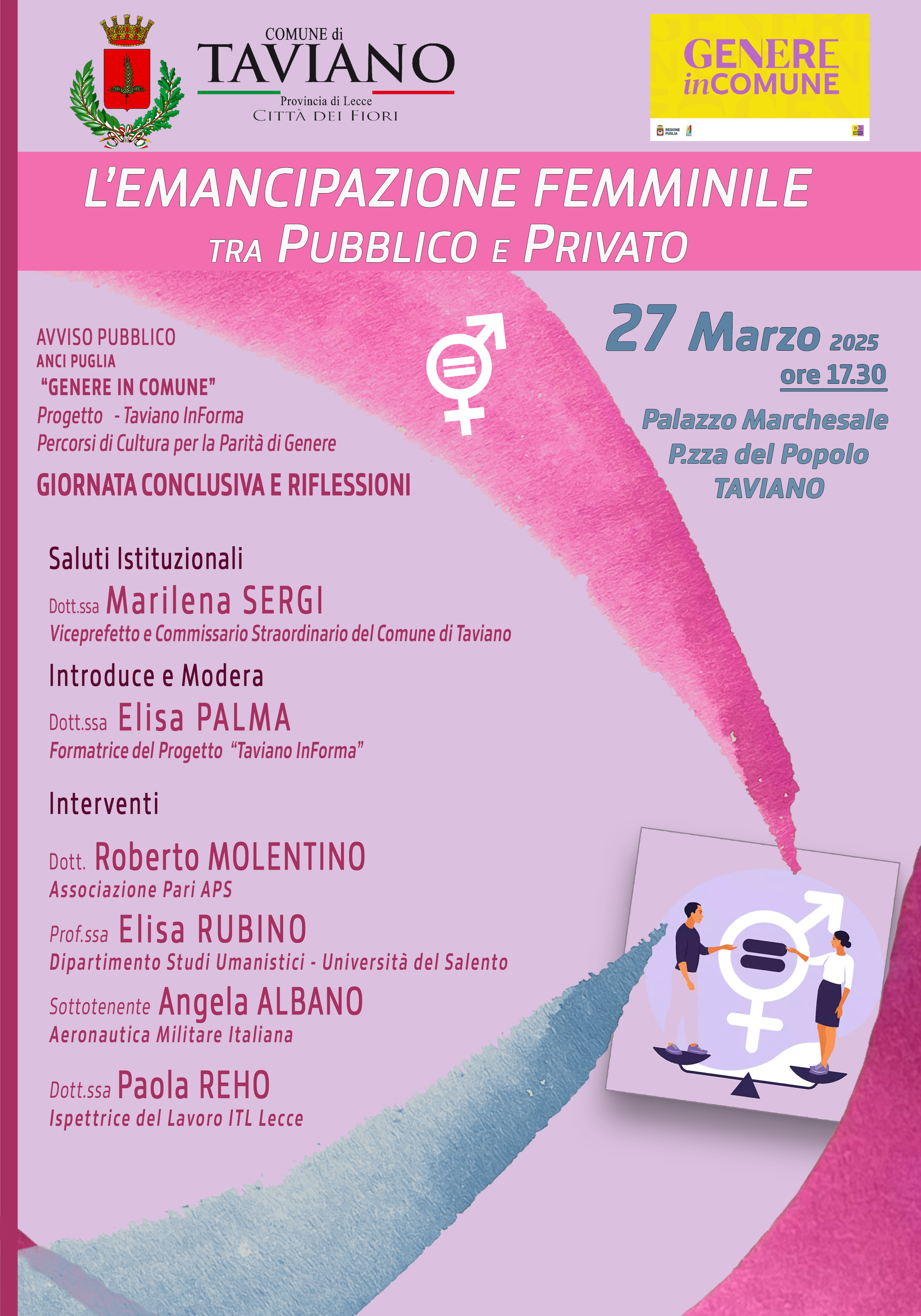 Nell'ambito del Progetto "TavianoInForma - Percorsi di Cultura per la Parità di Genere" realizzato con l'Avviso Pubblico Anci Puglia "GenereinComune, il Comune di Taviano organizza un incontro conclusivo dal titolo "L'EMANCIPAZIONE FEMMINILE TRA PUBBLICO E PRIVATO", in programma Giovedì 27 Marzo 2025 alle ore 17.30 presso il Palazzo Marchesale in Piazza del Popolo.