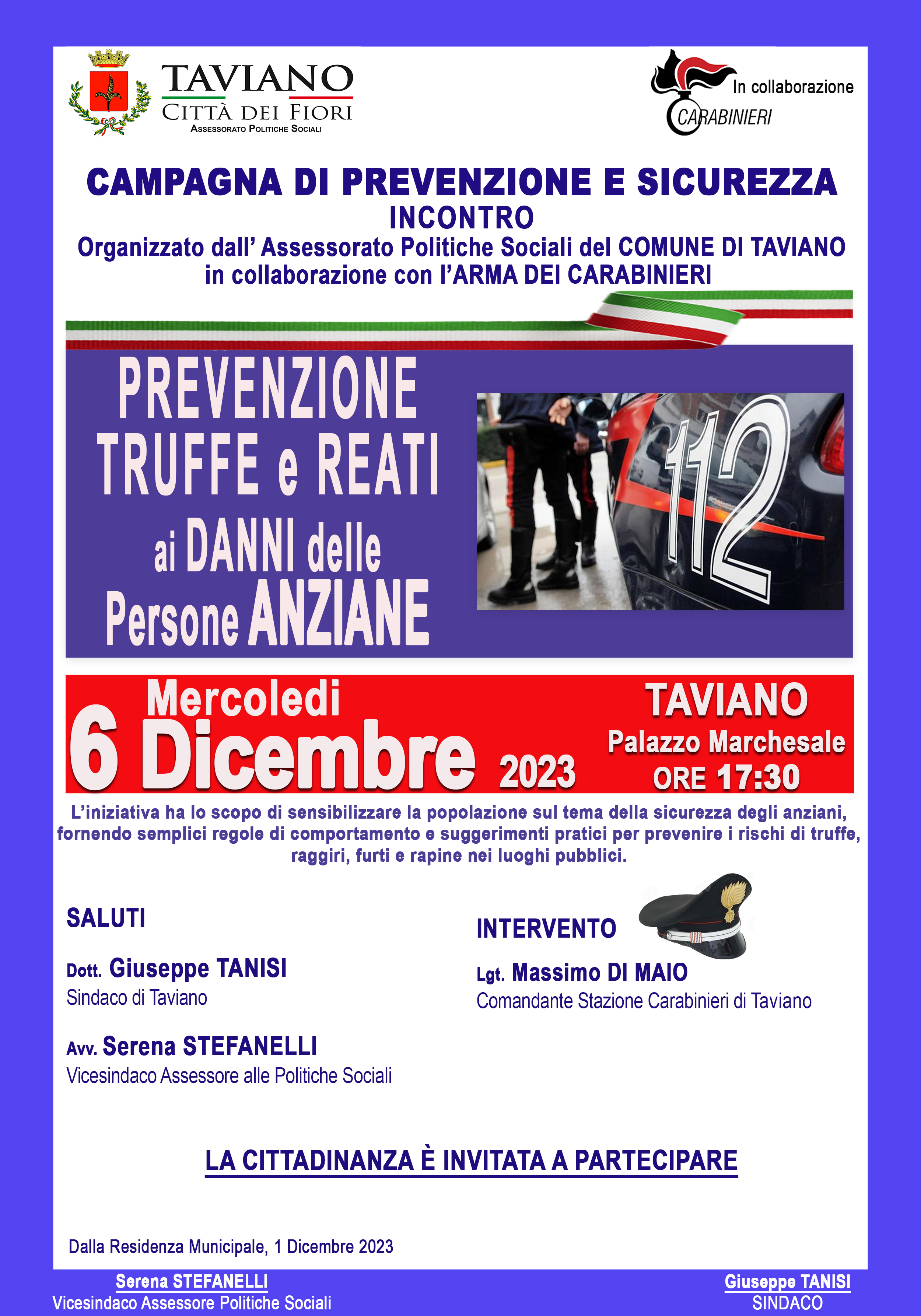 L’Amministrazione Comunale, Assessorato alle Politiche Sociali in collaborazione con l’Arma dei Carabinieri, organizzano un INCONTRO INFORMATIVO sui REATI ai DANNI DEGLI ANZIANI che si terrà MERCOLEDI 6 Dicembre 2023 alle ORE 17:30 nel Palazzo Marchesale di Taviano.