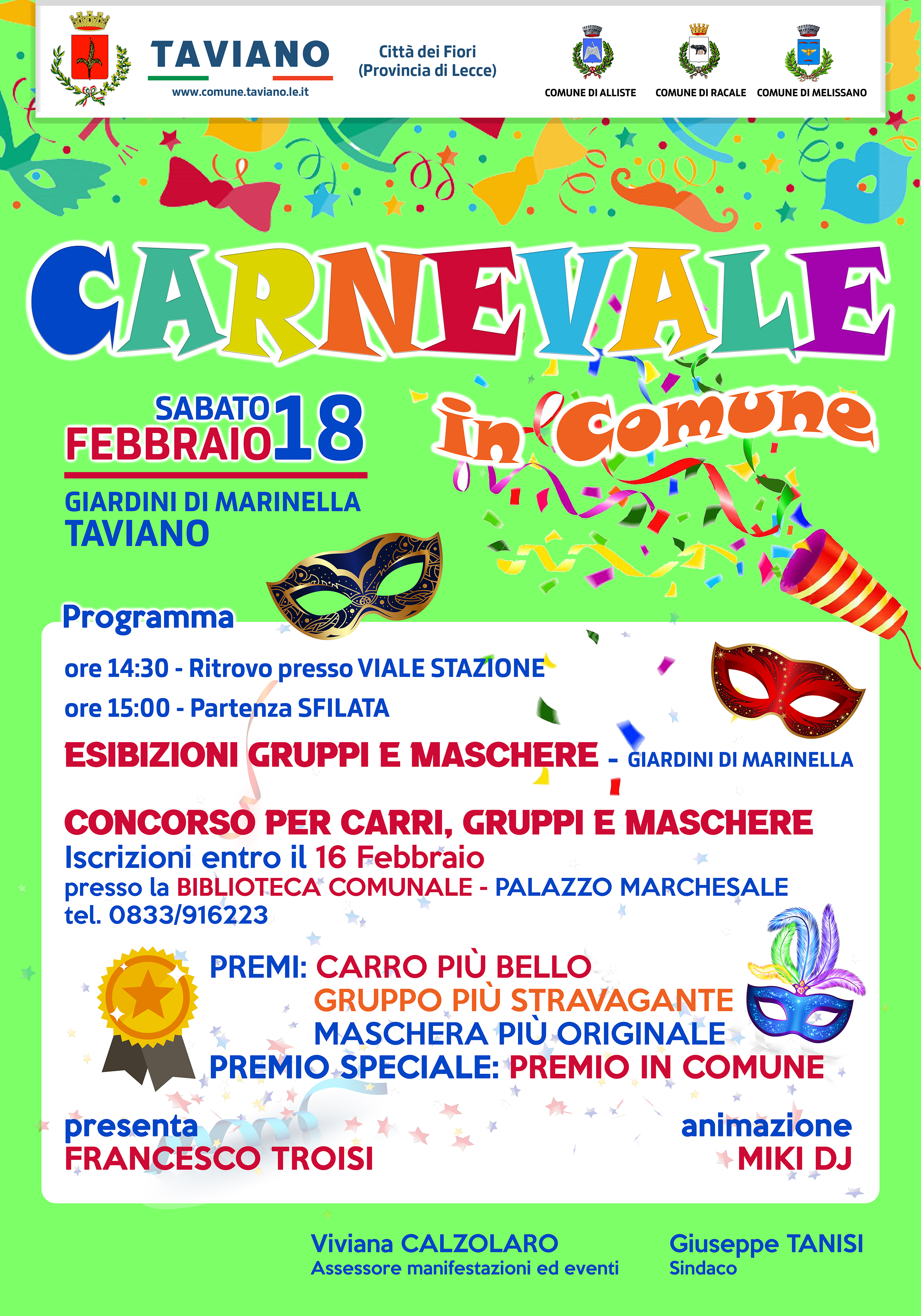 Il Comune di Taviano insieme al Comune di Racale, Comune di Alliste e Comune di Melissano organizzano la 1^ edizione del CARNEVALE in Comune.