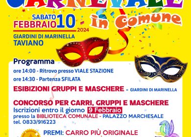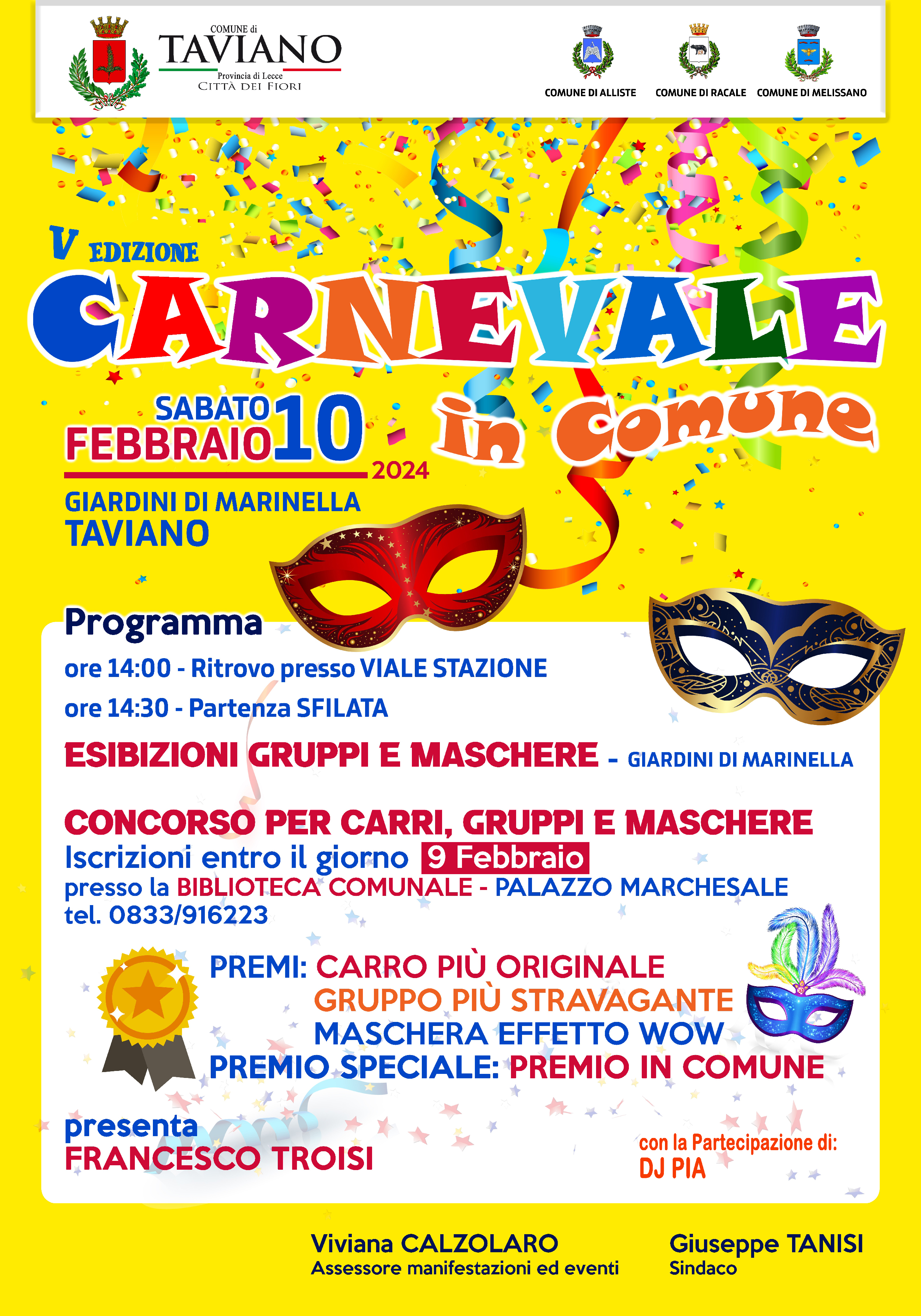 Il Comune di Taviano insieme al Comune di Racale, Comune di Alliste e Comune di Melissano organizzano la 2^ edizione del CARNEVALE in Comune.