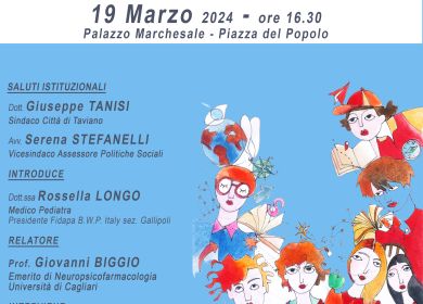 L’Amministrazione Comunale – Assessorato alle Politiche Sociali in collaborazione con Fidapa BPW Italy Sez. di Gallipoli organizzano un Convegno dal titolo “Stili di Vita, Neurosviluppo e Psicopatologia” in programma per martedì 19 Marzo alle ore 16.30 presso il Palazzo Marchesale in Piazza del Popolo a Taviano.