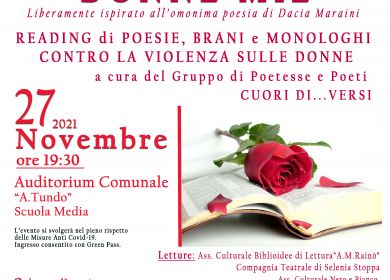 DONNE MIE, liberamente ispirato all'omonima poesia di Dacia Maraini – Reading di Poesie, Brani e Monologhi Contro la Violenza sulle Donne, a cura del Gruppo di Poetesse e Poeti CUORI DI...VERSI che terrà Sabato 27 Novembre alle ore 19:30 presso l'Auditorium Comunale "A. Tundo".