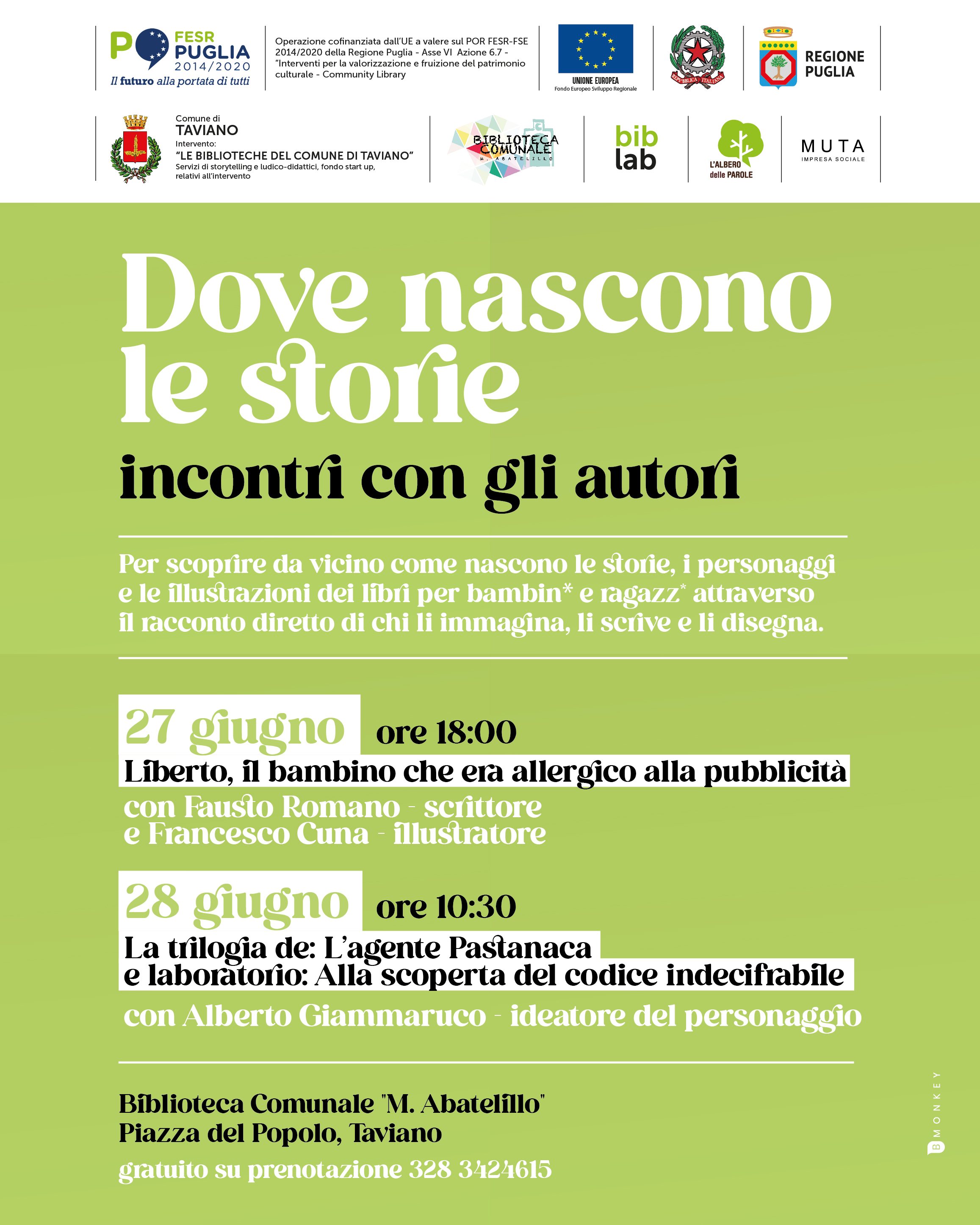 "Dove nascono le storie”: presso la Biblioteca Comunale "M. Abatelillo", previsti due incontri per capire come vengono ideate storie, personaggi e illustrazioni dei libri per bambinə e ragazzə attraverso il racconto diretto di chi li immagina, li scrive e li disegna.