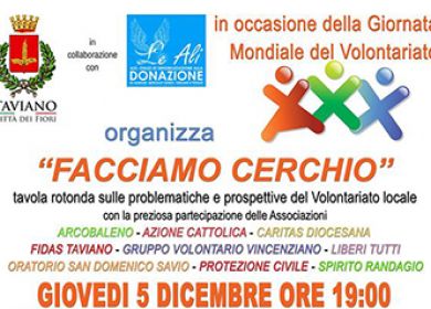 L' Amministrazione Comunale in collaborazione con l'Associazione le Ali e tutte le Associazioni di Volontariato tavianesi, VI INVITA all' incontro "FACCIAMO CERCHIO", nel giorno in cui si festeggia la Giornata Mondiale del Volontariato.