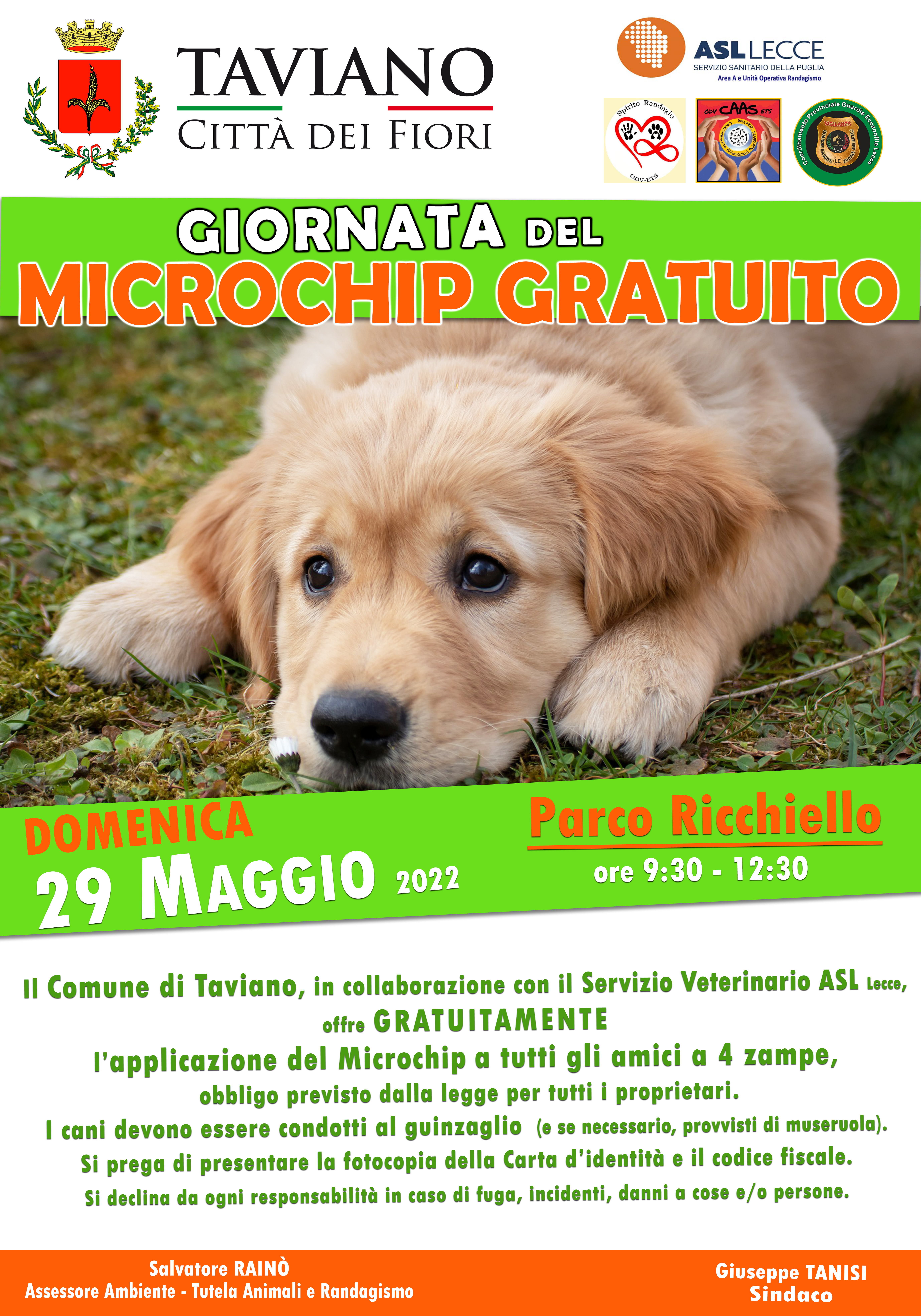 l Comune di Taviano, con l' Assessore all'Ambiente - Tutela Animali e Randagismo Salvatore Rainò, organizza la Giornata del Microchip Gratuito, per sensibilizzare la Cittadinanza verso la cultura del rispetto degli animali domestici e l'obbligatorietà dell'iscrizione all'anagrafe canina con l’applicazione del microchip per tutti gli amici a 4 zampe..