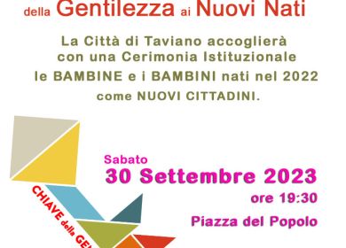 La data scelta dal Comune di Taviano è sabato 30 Settembre per il “Benvenuto Istituzionale” a tutte le Bambine e i Bambini nati nel corso del 2022, sarà una cerimonia simbolica in cui il Sindaco Giuseppe Tanisi e l’Assessore alla Gentilezza Serena Stefanelli accoglieranno i nuovi piccoli cittadini.