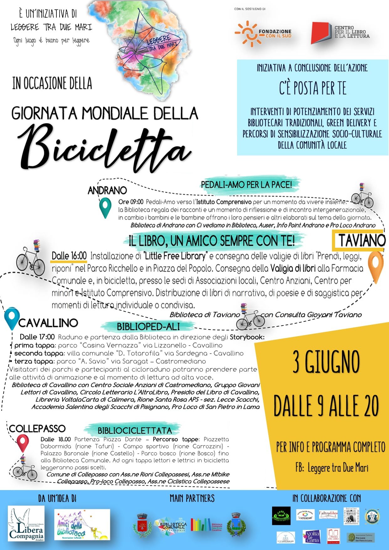 Il Comune di Taviano con la Biblioteca Comunale “M. Abatelillo” e la Consulta Giovani di Taviano , In occasione della Giornata Mondiale della Bicicletta e nell’ambito del progetto Leggere Tra Due Mari, partecipano all’iniziativa dedicata alla promozione della lettura con l’installazione di “LITTLE FREE LIBRARY” e la consegna delle Valigie di Libri “PRENDI, LEGGI E RIPONI”.