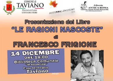 L'evento è organizzato dal Comune di Taviano in collaborazione con la Libreria Antica Roma e si terrà Sabato 14 DICEMBRE 2019 alle ore 18:30 presso la Biblioteca Comunale "M. Abatelillo" in P.zza del Popolo