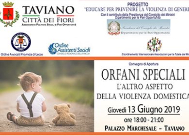 Si terrà Giovedì 13 Giugno dalle ore 18:00 alle 21:00, nel Palazzo Marchesale a TAVIANO, il Convegno dal titolo "ORFANI SPECIALI: L'ALTRO ASPETTO DELLA VIOLENZA DOMESTICA", la prima iniziativa che rientra nel più ampio Progetto "EDUCARE PER PREVENIRE LA VIOLENZA DI GENERE" finanziato dalla Presidenza del Consiglio dei Ministri - Dipartimento per le Pari Opportunità.