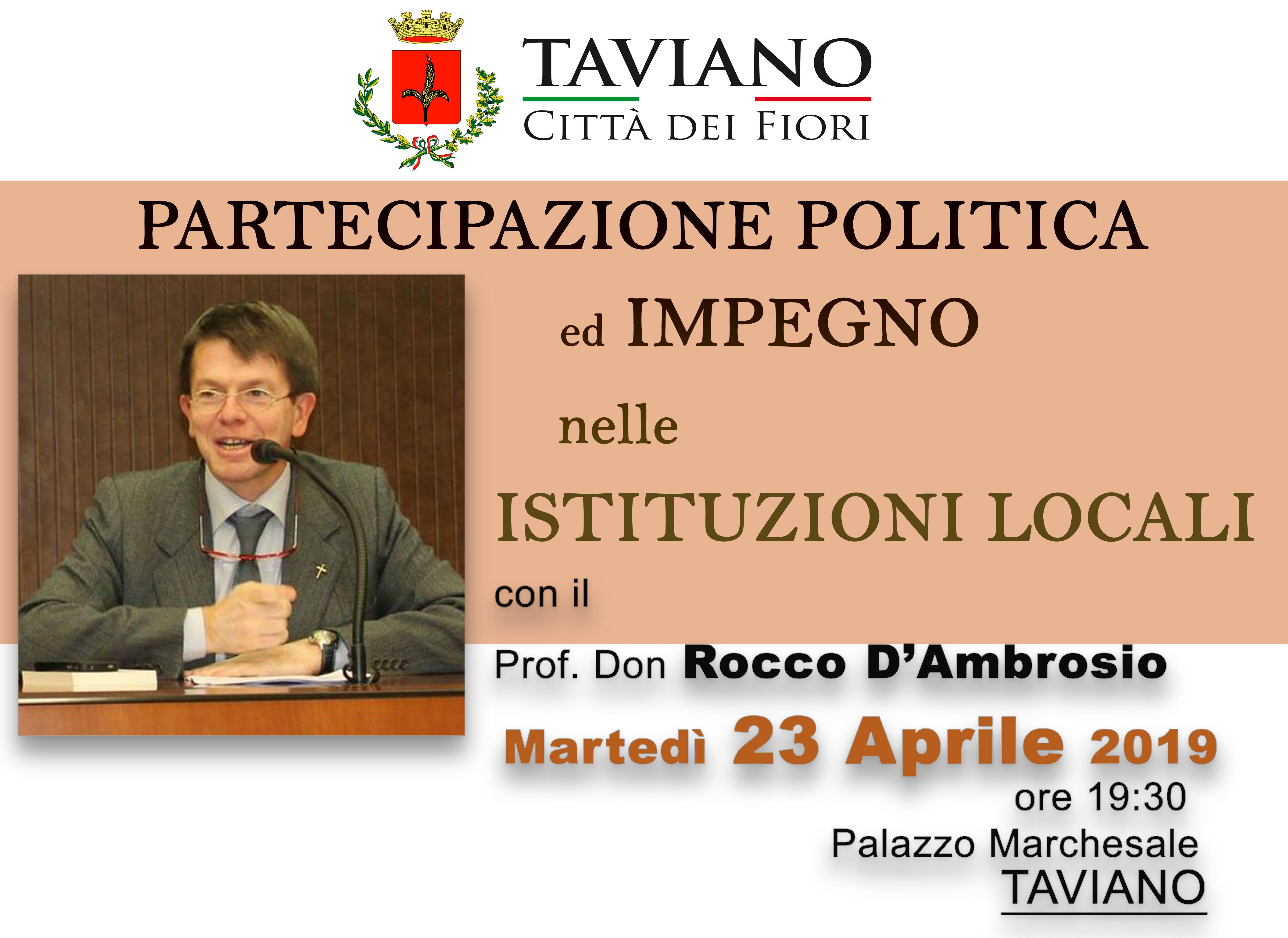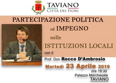 “Il bene comune è partecipazione dei cittadini, è una rinnovata fiducia nei governanti, è l’impegno dei governanti a servire concretamente il loro popolo…” sono le parole del Prof. Don Rocco D’AMBROSIO che avremo il piacere di ospitare a Taviano in occasione dell’incontro, organizzato dall’Amministrazione Comunale, dal titolo “PARTECIPAZIONE POLITICA ed IMPEGNO nelle ISTITUZIONI LOCALI”.