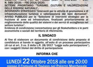 Il Sindaco, Giuseppe Tanisi, invita la cittadinanza all’incontro partecipativo che si terrà LUNEDI 22 Ottobre 2018 alle ore 20:00 presso il Palazzo Marchesale di Taviano, con gli attori locali e il partenariato economico-sociale al fine di illustrare i contenuti del bando regionale per la “RIVALORIZZAZIONE della VIABILITÀ interna e delle PIAZZE del CENTRO STORICO” ed elaborarne una proposta progettuale per la riqualificazione del nostro centro storico.