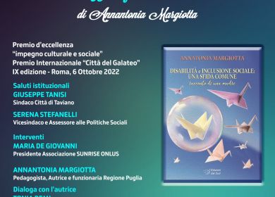 L’Amministrazione Comunale – Assessorato alle Politiche Sociali nell’ambito delle iniziative di sensibilizzazione su temi come la disabilità, finalizzate a porre l’attenzione sui vari aspetti che coinvolgono non solo le persone diversamente abili e le loro famiglie, ma anche tutti gli operatori sociali presenti sul territorio e il mondo della scuola, organizza una serata sul tema durante la quale sarà presentato il Libro “Disabilità e inclusione sociale: Una Sfida Comune” dell'autrice Annatonia Margiotta, pedagogista e soprattutto mamma di un ragazzo disabile impegnata ad affrontare le sfide quotidiane.