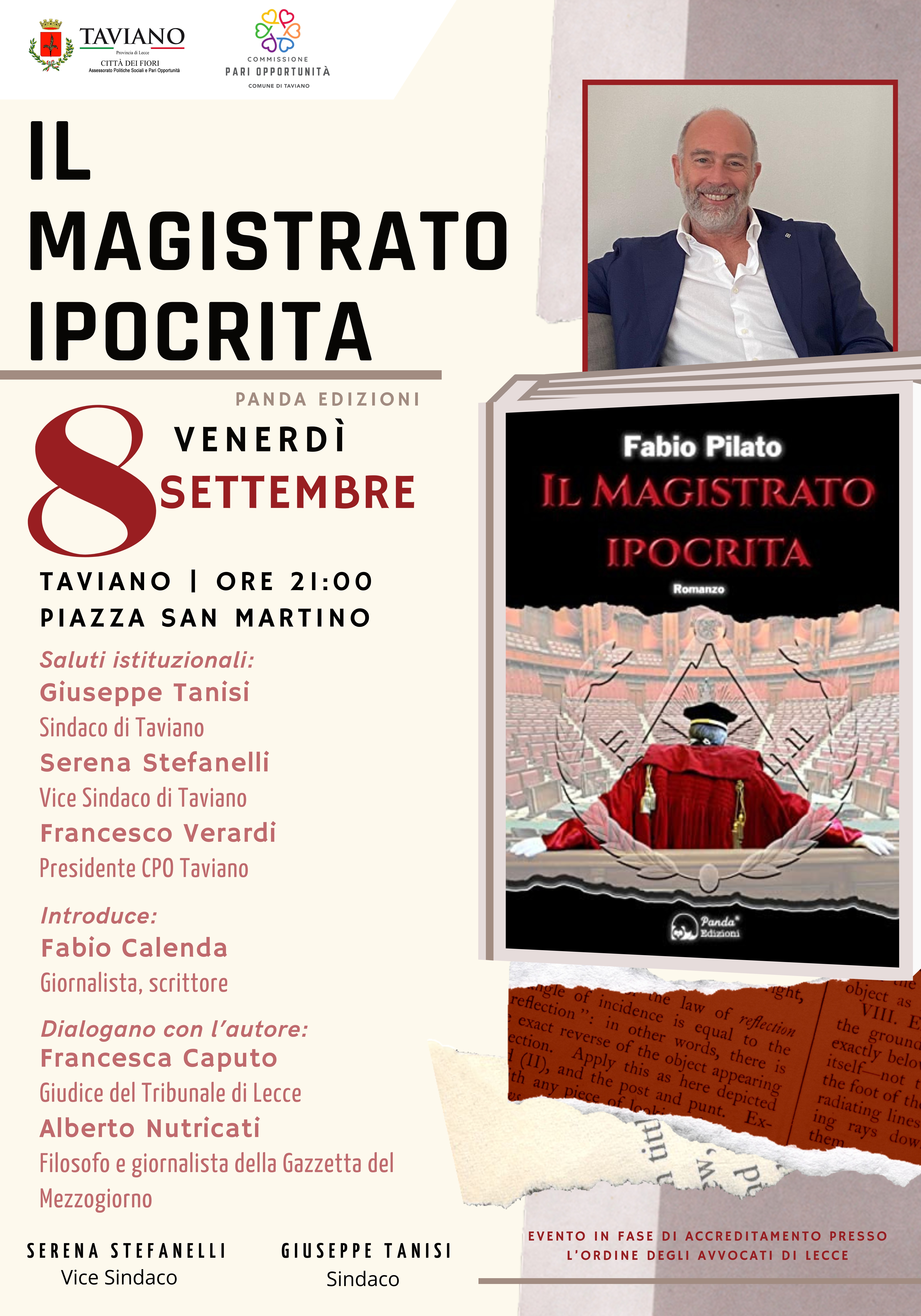 Presentazione del Libro "Il Magistrato Ipocrita" del Magistrato Fabio Pilato, venerdì 8 Settembre ore 21.00 Piazza San Martino, Taviano.