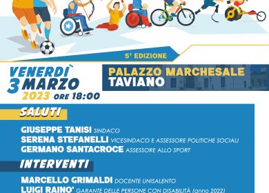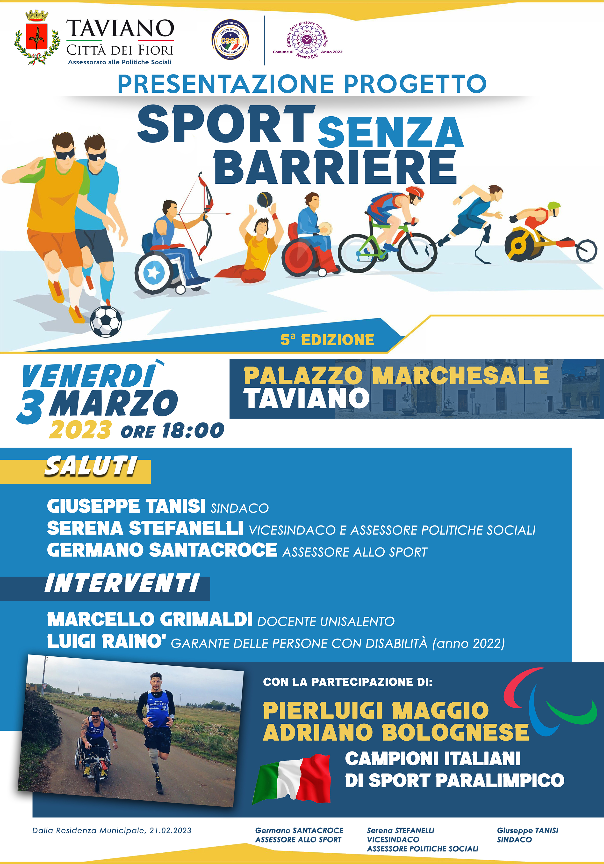 Prenderà il via a breve l’edizione 2023 del Progetto SPORT SENZA BARRIERE, programma gratuito di attività motorie specifiche per persone diversamente abili, promosso dall’Assessorato alle Politiche Sociali e dall’Assessorato allo Sport del Comune di Taviano.