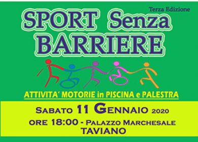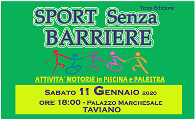 Per il terzo anno consecutivo riparte il progetto “Sport Senza Barriere” un programma gratuito di attività motorie specifiche per persone diversamente abili. Il programma di questa edizione sarà illustrato Sabato 11 Gennaio 2019 alle ore 18, presso il Palazzo Marchesale in P.zza del Popolo, alla presenza del Sindaco Giuseppe Tanisi, dell’Assessore alle Politiche Sociali e Sport, Serena Stefanelli.