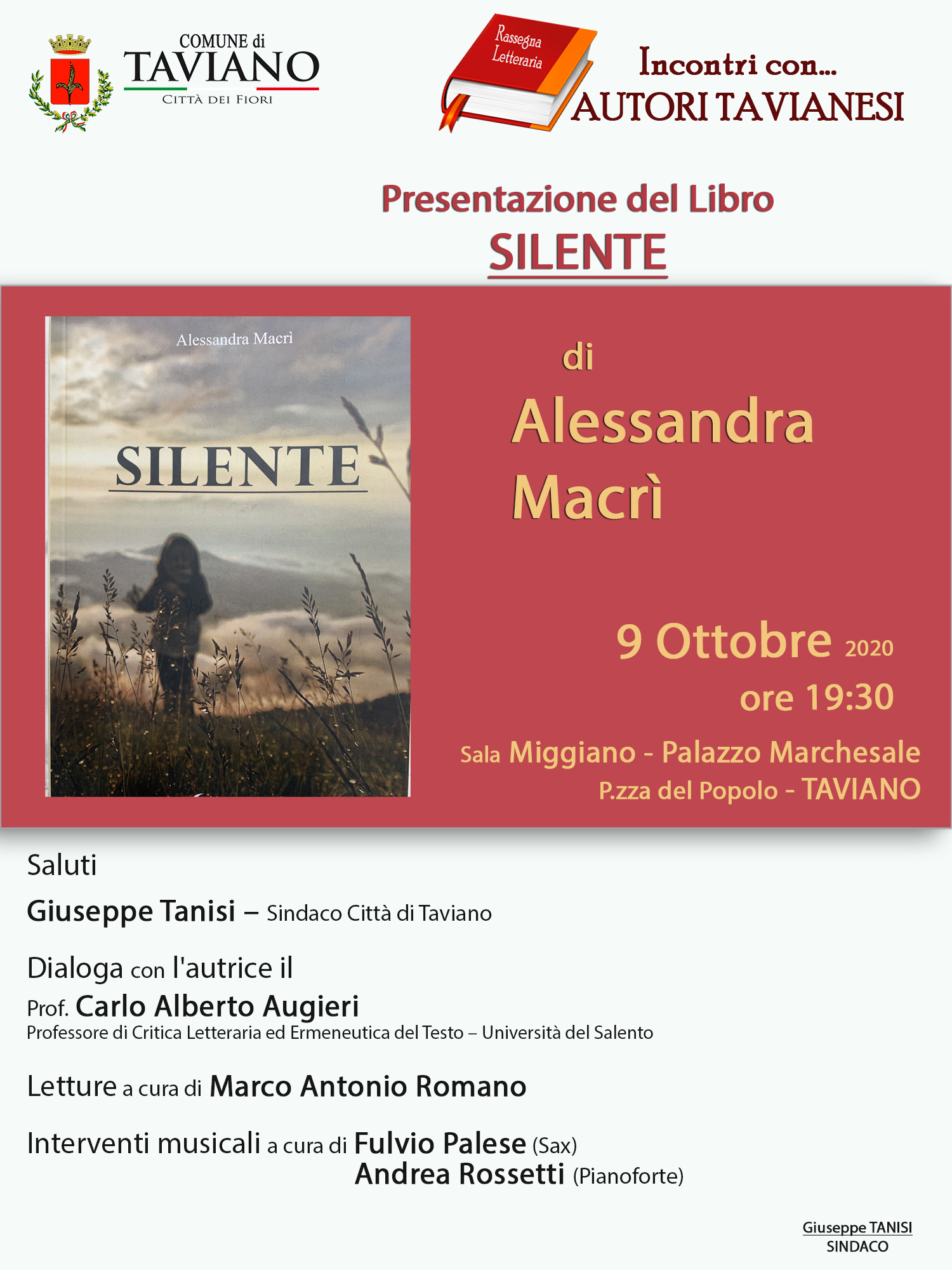 Venerdì 9 Ottobre alle ore 19:30, Sala Miggiano - Palazzo Marchesale, si terrà la presentazione del libro dal titolo "Silente" scritto dalla Prof.ssa Alessandra Macrì, docente di italiano e storia.