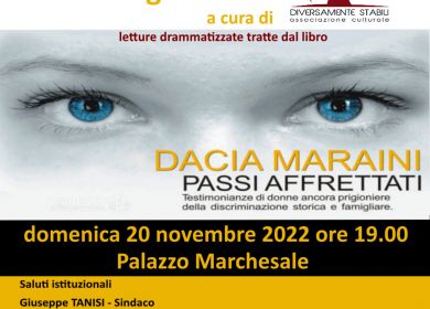 In Occasione della Giornata Internazionale Contro la Violenza sulle Donne, che ridace il 25 Novembre, l'Amminstrazione Comunale organizza in collaborazione con l'Associazione Culturale Diversamente Stabili un READING TEATRALE sulle LETTURE TRATTE DAL LIBRO di DACIA MARAINI "Passi Affrettati".