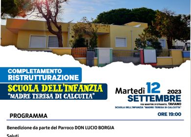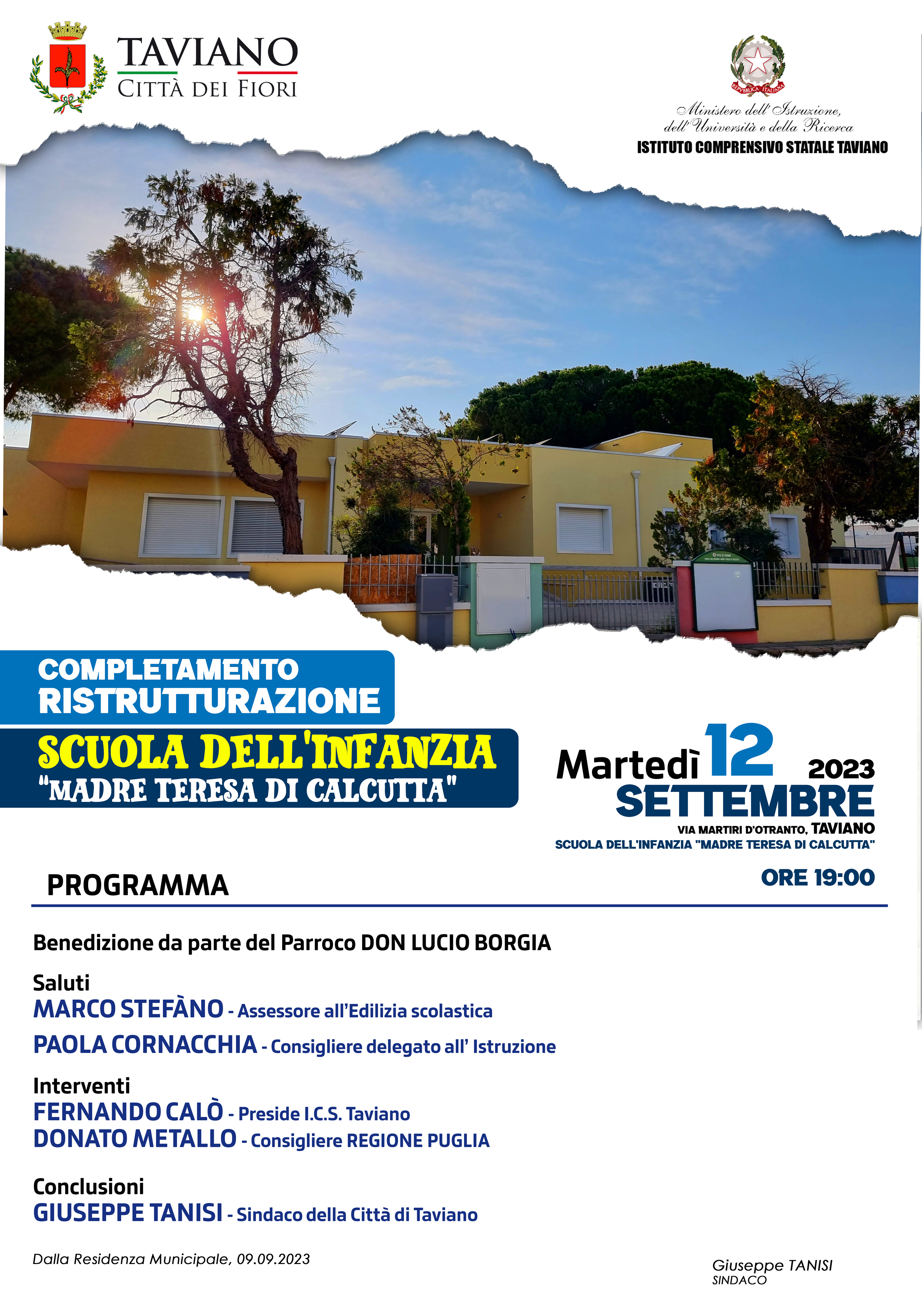 È stata riconsegnata il 13 Settembre 2023, alla presenza del Consigliere regionale e Presidente Commissione Cultura Regione Puglia Donato Metallo, alla comunità cittadina la Scuola per l' Infanzia "Madre Teresa di Calcutta" in via Martiri d' Otranto, dopo i lavori di RISTRUTTURAZIONE, ammodernamento e messa in sicurezza che l'hanno interessata; un progetto di Efficientamento Energetico dell' Amministrazione Comunale, finanziato per un importo di €. 930.000,00 dalla Regione Puglia.