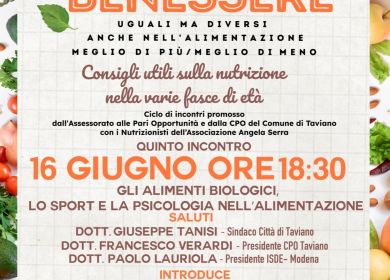 Ultimo appuntamento del percorso "RIPARTIAMO DAL BENESSERE", ciclo di incontri promosso dall'Assessorato alle Pari Opportunità, dalla Commissione Pari Opportunità del Comune di Taviano e dall'Associazione Angela Serra, dedicati al tema della Nutrizione nelle varie fasce di età.