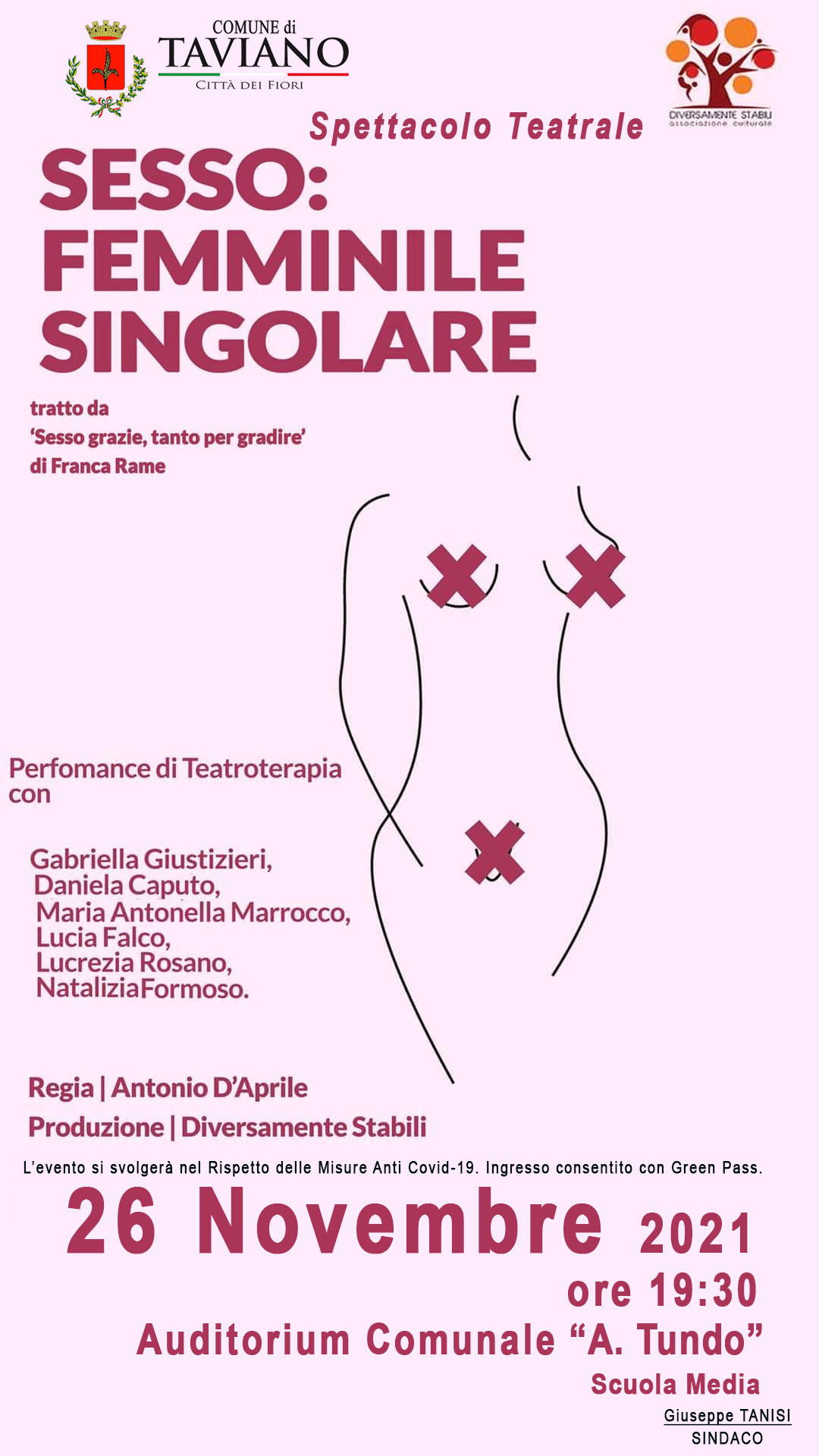 Il Comune di Taviano in occasione della Giornata Internazionale Contro la Violenza sulle Donne presenta uno spettacolo teatrale dedicato alle donne, curato dall’Associazione Diversamente Stabili per la regia di Antonio D’Aprile e tratto dal testo di Franca Rame, che ha saputo parlare delle donne senza tabù.
