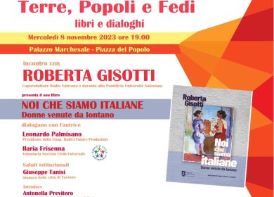 Mercoledì 8 novembre, presso il Palazzo Marchesale a Taviano, la Prof. Roberta Gisotti, giornalista, già caporedattore alla Radio Vaticana, dove ha lavorato al Giornale Radio per oltre 30 anni, autrice e consulente in Rai, docente di Economia dei Media alla Pontificia Università Salesiana, dialogando con Leonardo Palmisano e Ilaria Frisenna, con il libro “NOI CHE SIAMO ITALIANE. Donne venute da lontano”, indaga la realtà di donne provenienti da Paesi stranieri, che appartengono alla prima, seconda o terza generazione di immigrati o che sono approdate in Italia per studiare, lavorare o per amore.