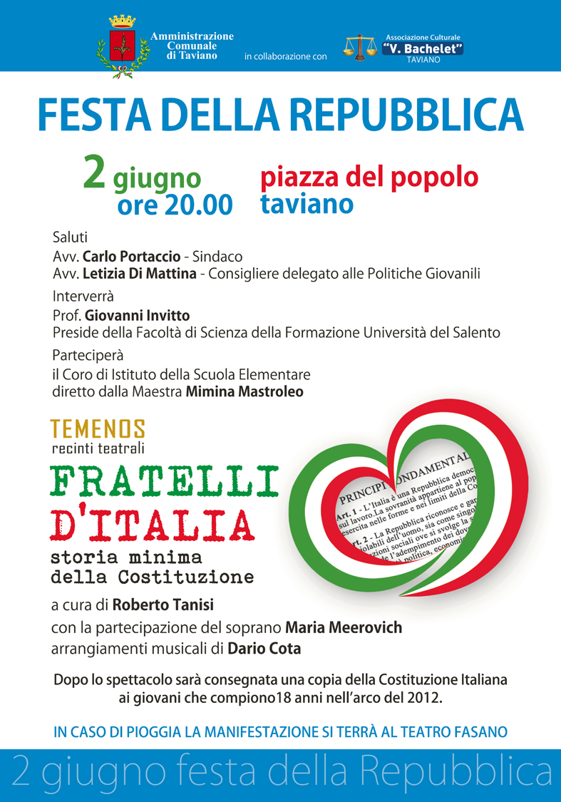 manifestazione pubblica - sabato 2 giugno ore 20.00 Piazza Del Popolo - con l'intervento del Prof. Giovanni Invitto - Preside della Facoltà di Scienze della Formazione dell'Università del Salento...