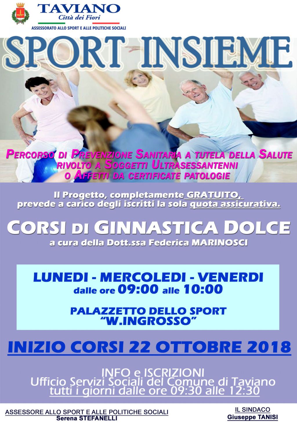 L’Assessorato allo Sport e Politiche Sociali del Comune di Taviano, ripropone anche per l’anno 2018/2019 il progetto SPORT INSIEME, il cui obiettivo è quello di considerare lo Sport uno strumento per migliorare le relazioni sociali e la qualità della vita.