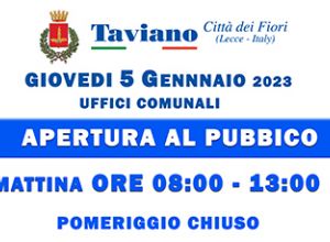 Si Avvisano gli utenti che nella giornata di Giovedì 5 Gennaio 2023 gli Uffici Comunali effettueranno l'orario di Apertura al Pubblico SOLO la MATTINA dalle ore 08:00 alle 13:00.