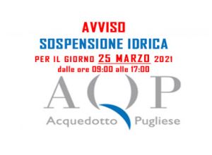 Si Avvisa la Cittadinanza che il giorno 25 Marzo 2021, dalle ore 09:00 alle ore 17:00, sarà effettuata da parte di AQP l'interruzione dell'erogazione idrica in tutto l'abitato del Comune di Taviano.
