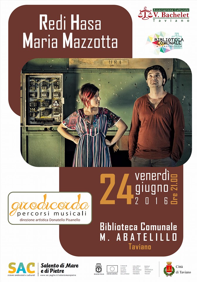Venerdì 24 giugno 2016 ore 21, presso la Biblioteca Comunale "Martino Abatelillo", nell'ambito delle iniziative SAC, l'Associazione Culturale Bachelet di Taviano propone: Redi Hasa Maria...
