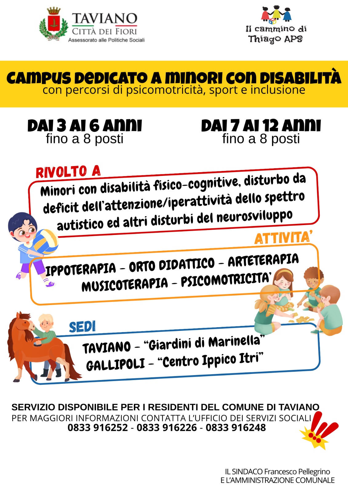 Il Comune di Taviano, ha attivato da diversi anni un Progetto di Psicomotricità, Sport e Inclusione che si rivolge a bambini e ragazzi affetti dal disturbo del neurosviluppo e dello spettro autistico che sono in condizioni di fragilità socio-economiche.