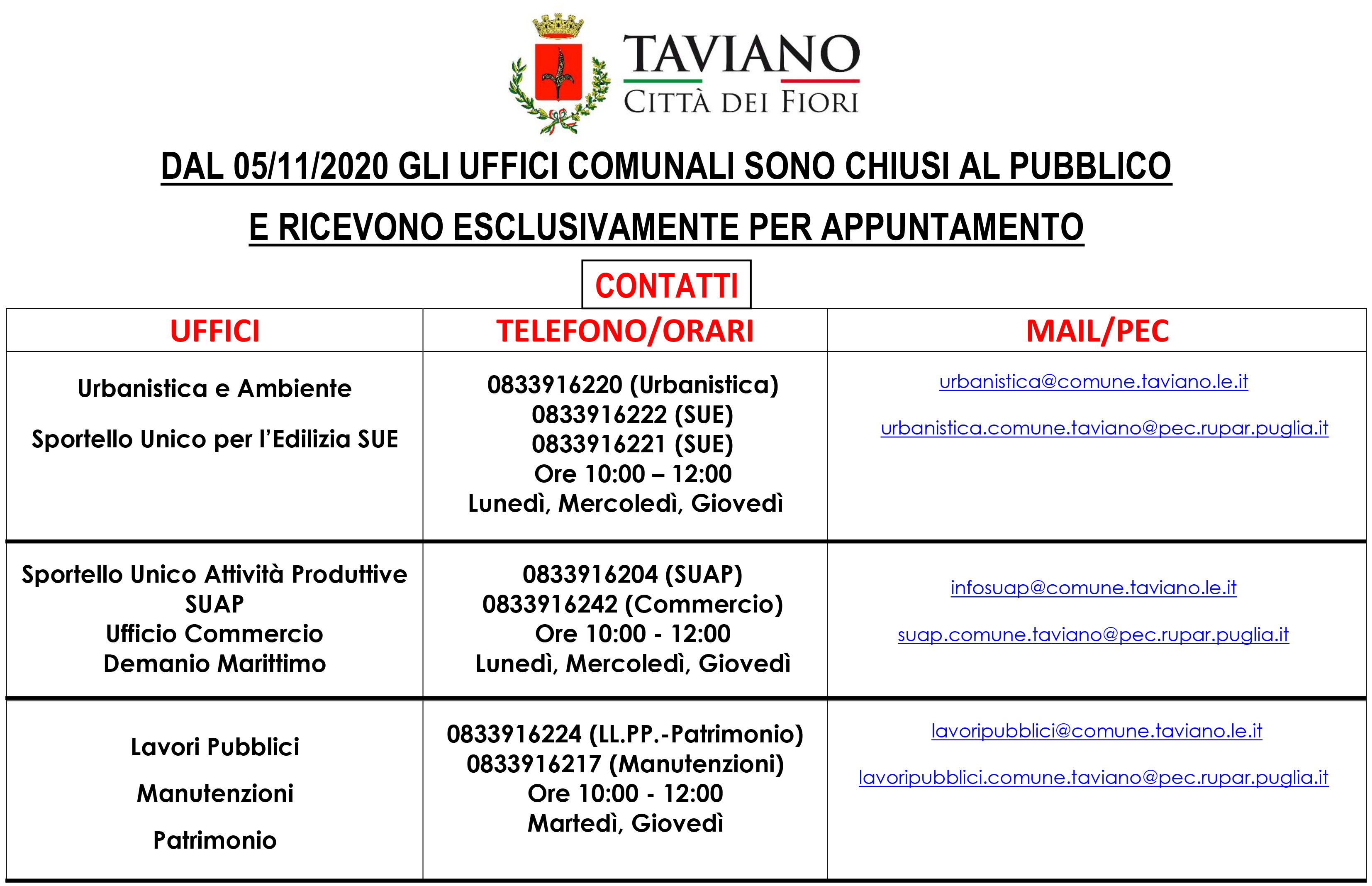 Nei documenti allegati è possibile scaricare l'Avviso e l'Elenco completo con tutti i Contatti degli Uffici Comunali con i giorni disponibili per concorare un appuntamento.