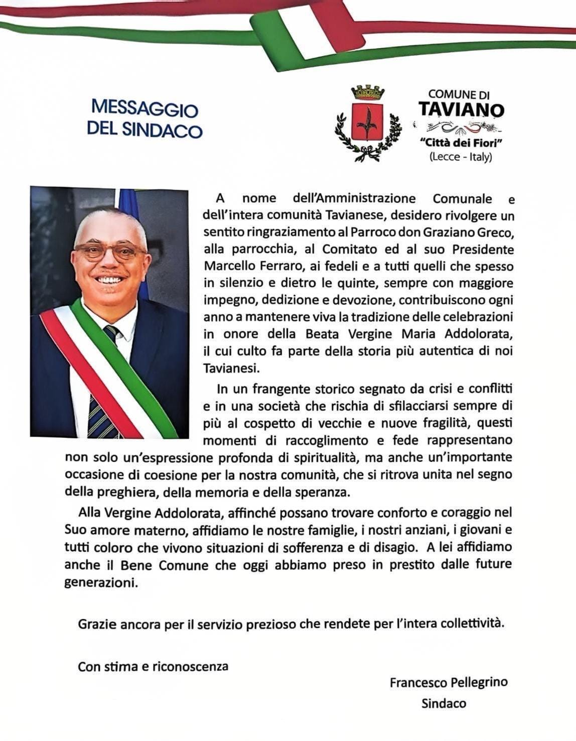 Messaggio del Sindaco in occasione dei festeggiamenti della B.V.M. Addolorata, 15 Settembre 2025.