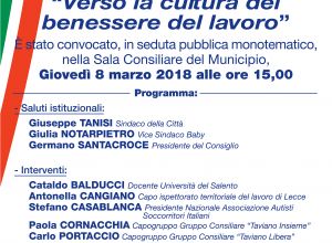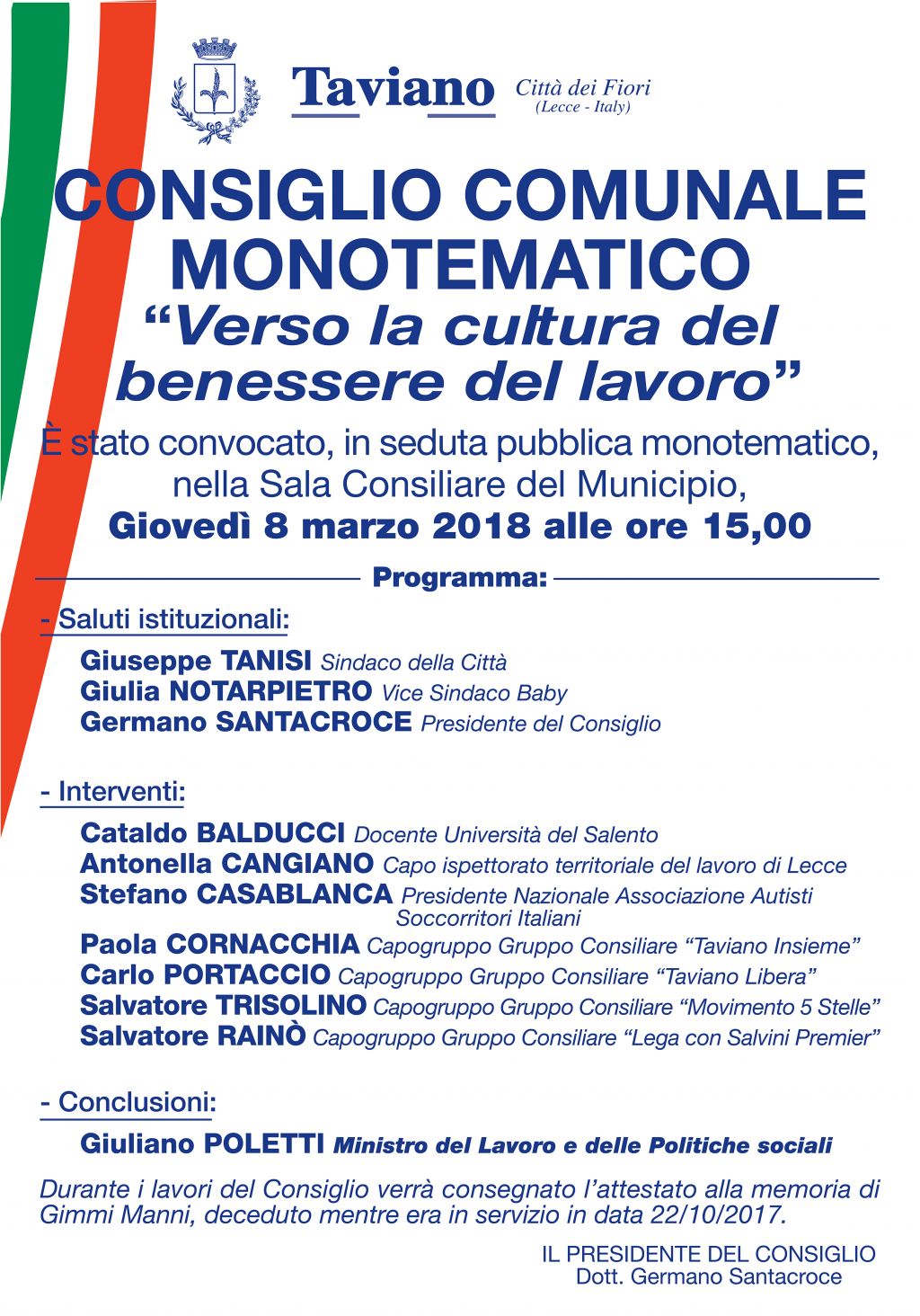 Giovedì 8 MARZO 2018 - ore 15:00 Convocazione del CONSIGLIO COMUNALE MONOTEMATICO “ verso la cultura del benessere del lavoro”