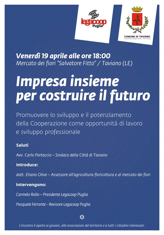 Venerdì 19 aprile, alle ore 18:00, presso il Mercato dei fiori “Salvatore Fitto” di Taviano (LE) si terrà l’incontro “Impresa insieme per costruire il futuro”a cura di Legacoop Puglia e...