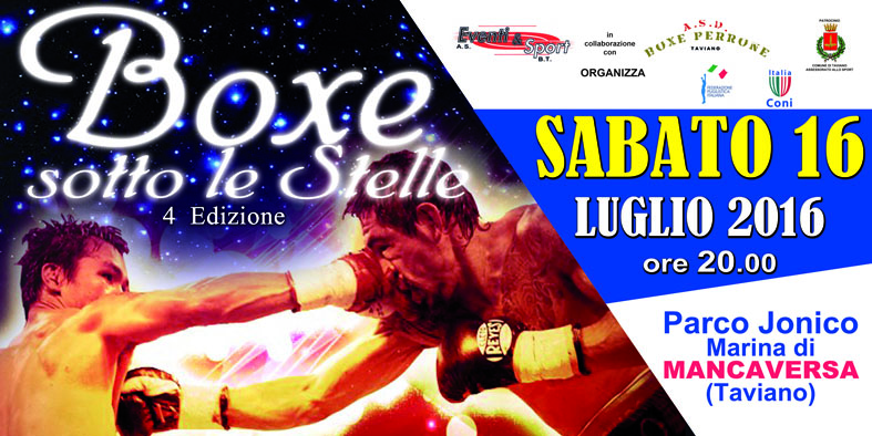Nell'ambito del programma delle Manifestazioni Estive "TAVIANO | MANCAVERSA 2016", sabato 16 luglio, ore 20, presso il Parco Ionico in MANCAVERSA, si terrà la quarta edizione di "BOXE SOTTO LE...