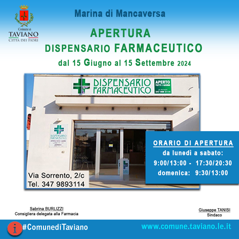 Con Decreto Sindacale n. 3 del 13/06/2024 è stata autorizzata l’Apertura del Dispensario Farmaceutico nella Marina di Mancaversa, che sarà attivo per il periodo dal 15 GIUGNO al 15 SETTEMBRE 2024.
