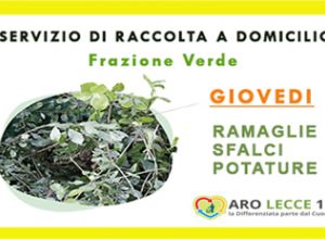 Tutti i Giovedì, a partire dal 18 Giugno 2020, verrà effettuato il ritiro domiciliare della Frazione di Verde ovvero RAMAGLIE, SFALCI e POTATURE domestiche, oltre all'organico, nel Comune di Taviano e nella Marina di Mancaversa.
