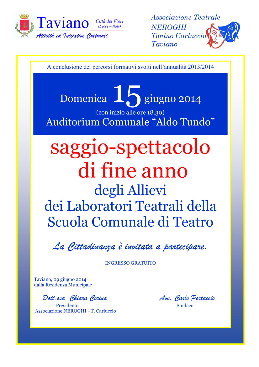 domenica 15 giugno p.v. (con inizio alle ore 18.30), presso l'Auditorium comunale "Aldo Tundo" (plesso scolastico "Alberto De Blasi"), a conclusione dei corsi formativi del laboratori teatrali...