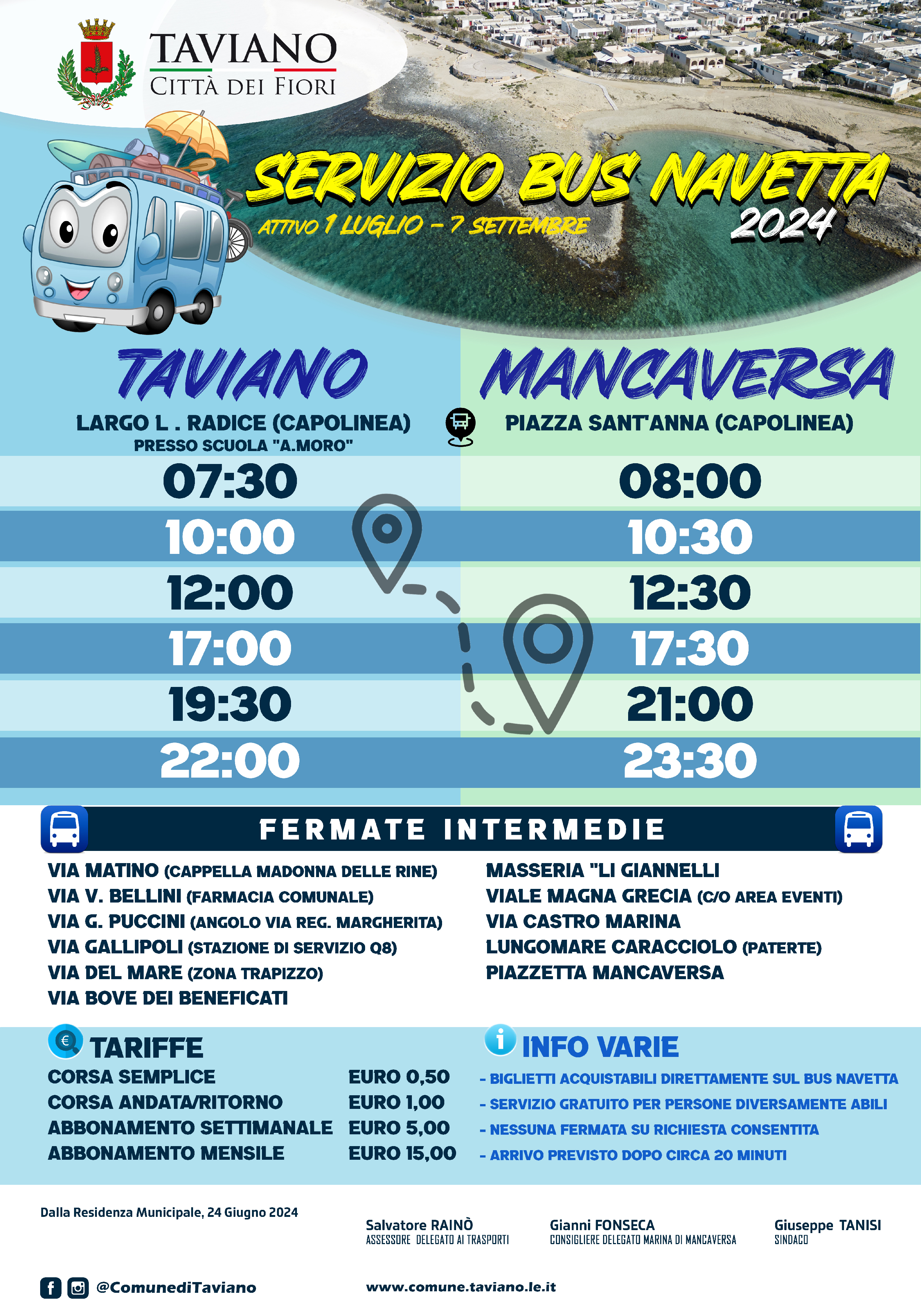 Si Avvisa la Cittadinanza che dall'1 LUGLIO 2024, sarà ATTIVO il Servizio di BUS NAVETTA che tutti i giorni effettuerà il collegamento tra TAVIANO e la Marina di MANCAVERSA sino al 7 Settembre 2024.