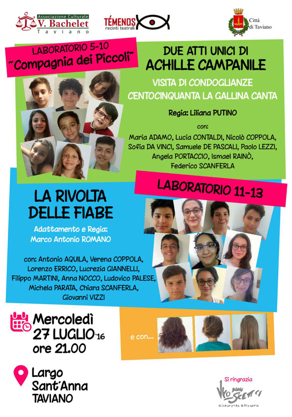 Questa sera, alle ore 21, a TAVIANO in largo Sant'Anna, nell'ambito delle manifestazioni estive "TAVIANO | MANCAVERSA 2016", l'Associazione Bachelet e Témenos recinti teatrali, con il patrocinio...