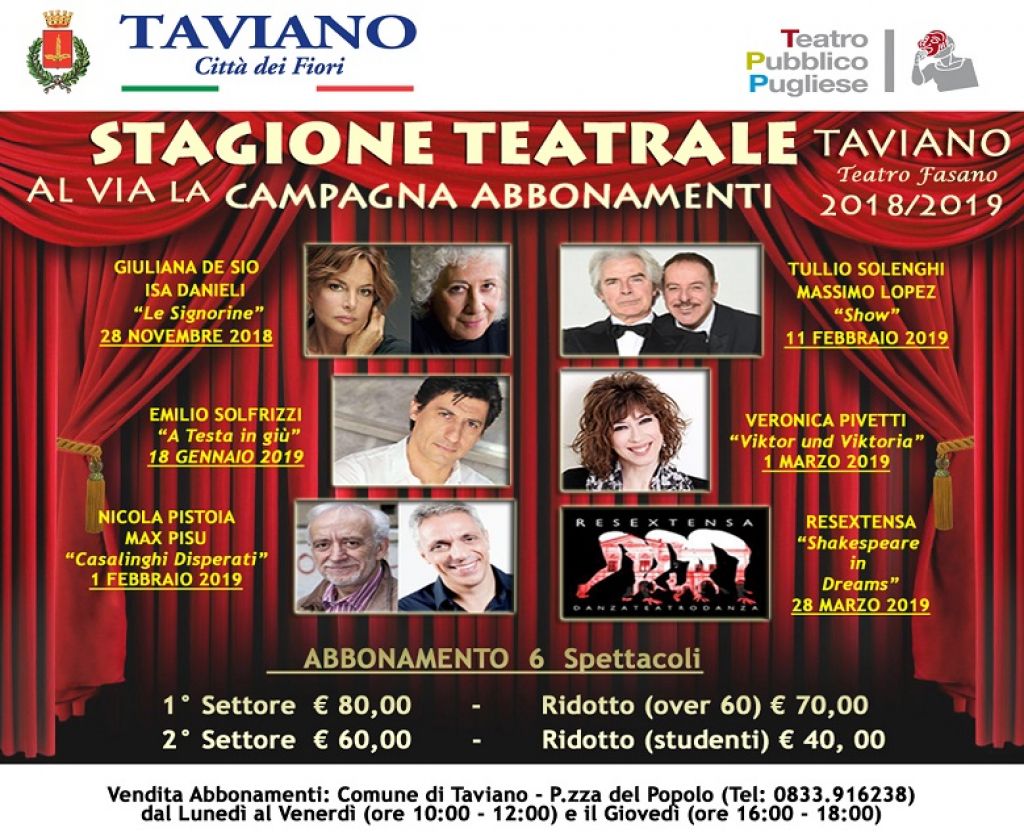 Organizzata in collaborazione con il Teatro Pubblico Pugliese AL VIA LA CAMPAGNA ABBONAMENTI per la STAGIONE TEATRALE 2018/2019 A partire da Lunedì 15 Ottobre, è possibile Abbonarsi alla nuova...