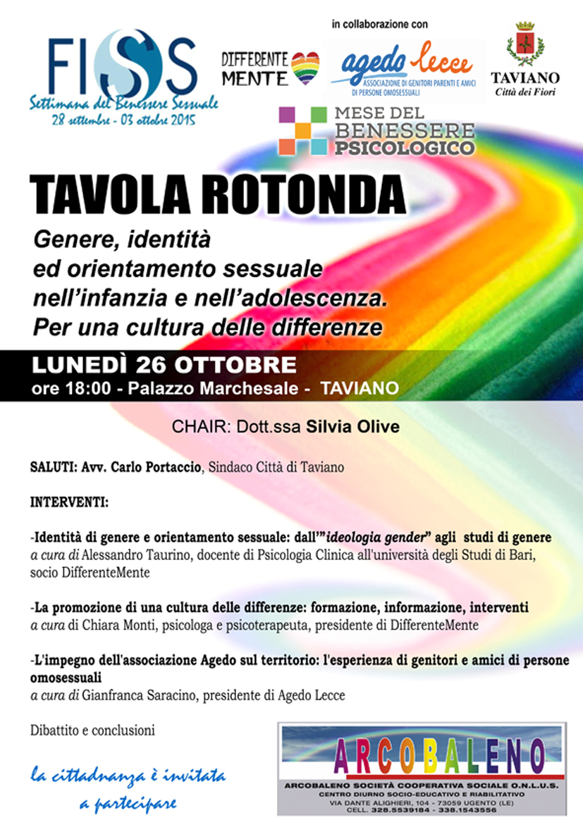 Lunedì 26 ottobre 2015 (ore 18.00) presso la sala polifunzionale "Armando Ria" del palazzo marchesale "De Franchis, TAVOLA ROTONDA sul tema: Genere ed orientamento sessuale...