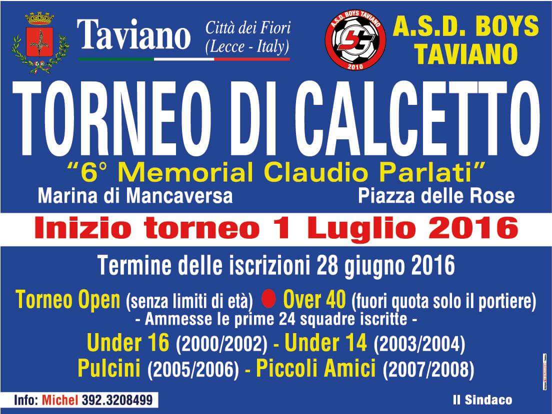 Il Torneo di calcetto  2016 "VI Memorial Claudio Parlati" inizia venerdì 01 luglio.Per le iscrizioni c'è tempo fino a martedì 28 giugno.info: Michel 392.3208499Visualizza e/o scarica il...