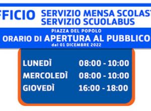 Si avvisa che l'Ufficio Servizio Mensa Scolastica e Servizio Scuolabus a partire dal 1 Dicembre 2022 effettuerà un nuovo orario di apertura al pubblico.