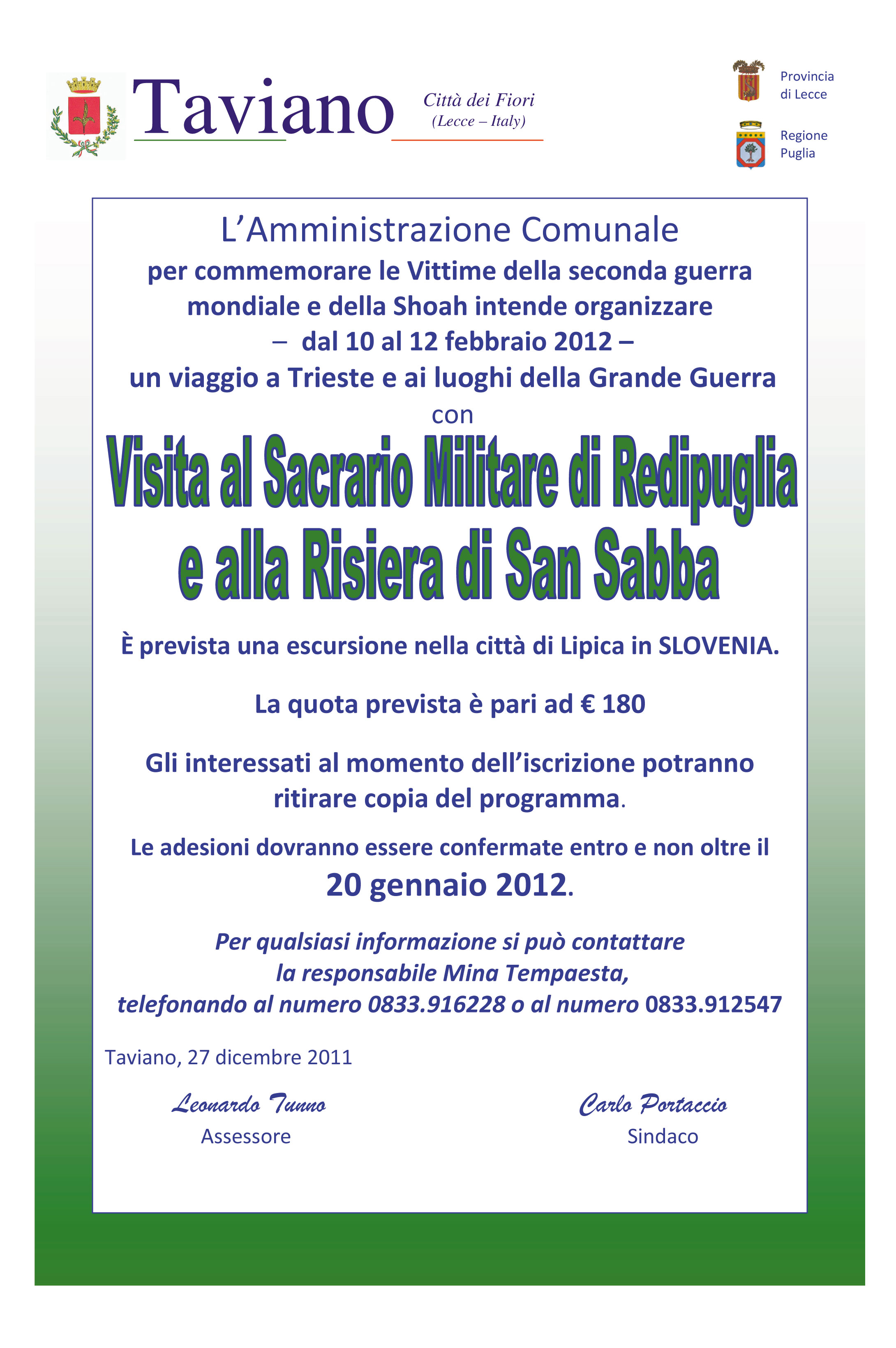 L'Amministrazione comunale organizza un viaggio con visita al Sacrario Militare di Redipuglia e alla Risiera di San Sabba - dal 10 al 12 febbraio 2012 -...